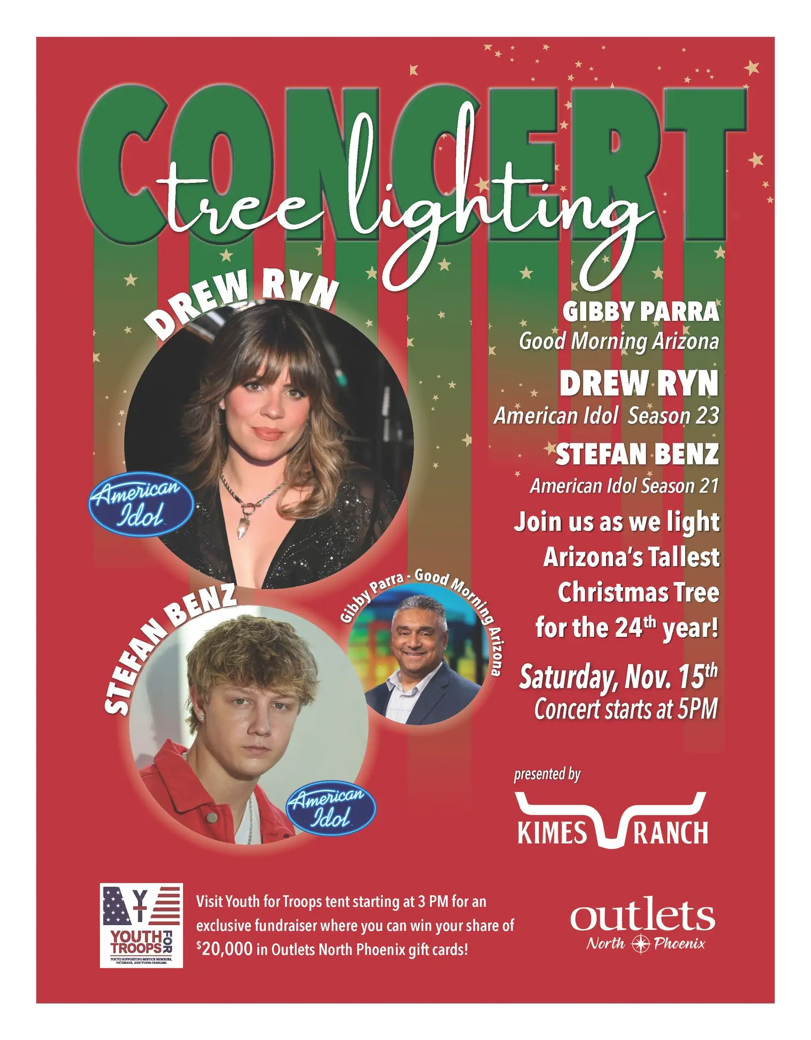 Join us for the 24th Annual Tree Lighting Concert presented by Kimes Ranch on Saturday, November 15, 2025, at 5 PM. Kick off the holiday season with a festive evening hosted by Gibby Parra from Good Morning Arizona, featuring live performances from American Idol stars Drew Ryn and Stefan Benz. Experience the magic of the season at this holiday favorite!